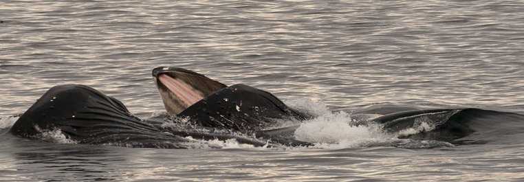 In the afternoon we encountered a humpback whale that breached, slapped its pectoral fins, rolled, and breached again. It was if it had an exercise program it repeated over and over. After an early dinner the show really began. When we arrived on deck it seemed like each of ten whales in sight had its mouth open as it lunged for a mouthful of krill. Today’s photo is of two whales feeding side-by-side, the second showing the pink roof of its mouth. So it went until there wasn’t enough light to see. What a way to end another extraordinary day in Southeast Alaska!