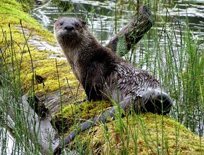 National Geographic Sea Bird glided over a speckled sea that foretold the weather of the day. Just off Peril Strait on Baranof IsIand is Lake Eva, nestled in an old growth forest. An excellent trail parallels a stream that connects the lake with the sea. Sections of slow water have gravel perfect for salmon spawning. The creek leads to a tumbling cascade that ends in a winding, intertidal backwater lined with rockweed, old butter clam shells, dead salmon carcasses, and the tracks of brown bears. This is a well-known destination in Southeast Alaska because of its stunning beauty and fishing potential. The trail has views over the intertidal area, the waterfall, and a pool of milling pink, chum, and sockeye salmon. Those on longer hikes made their way through the forest to the lake and a grove of four giant trees. One group heard some odd noises then watched as two river otters swam skeptically towards them. Their intense curiosity drew them closer and closer as the hikers stayed very quiet and still. From only 30 feet away they stared with amusing curiosity then, seeming satisfied, they crawled back over the floating logs and off to another agenda.