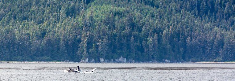 After lunch we sailed south through the Chatham Strait and kept a keen eye out for whale activity. We were richly rewarded for our efforts, and just after lunch ended we received the call, “Humpbacks bubblenetting!” Bubblenetting is a cooperative feeding behavior where four or more humpbacks work together to feed on herring. One whale encircles the herring with bubbles while another uses a special sound to scare them. At the same time another whale uses his white fins to keep the herring within the circle of bubbles. The whales then rise quickly to the surface right through the center of the bubble ring and erupt from the water with mouths agape to engulf herring. It is spectacular to see and we were lucky enough to watch this unusual behavior for over 2:30 hours!