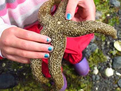 Lake Eva was the destination for our morning explorations. The tide was incredibly low, so low that a number of sea stars were temporarily left high and dry on the clam and cockle strewn beach. We took the opportunity of a close look to examine their tube feet and admire how charming they looked as temporary haberdashery. Yes, that means we put them on our heads.