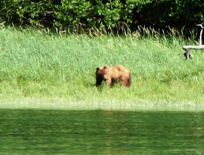 Groups headed off into the woods while others paddled around the small bay watching and listening to eagles and ravens. All of a sudden, the call came out that a brown bear was seen on one of the small islands. The bear was small and probably only 4 years old. He or she was busy munching on grass and waiting patiently for the salmon to make their way from the Pacific Ocean through the fjords and water ways searching for their natal stream. The kayakers had great views of the bear as he made his way along the grassy shore. The walkers and hikers enjoyed the trail and the many wildflowers that are out right now. At the end of the walk there were even some swimmers enjoying the sunny beach.