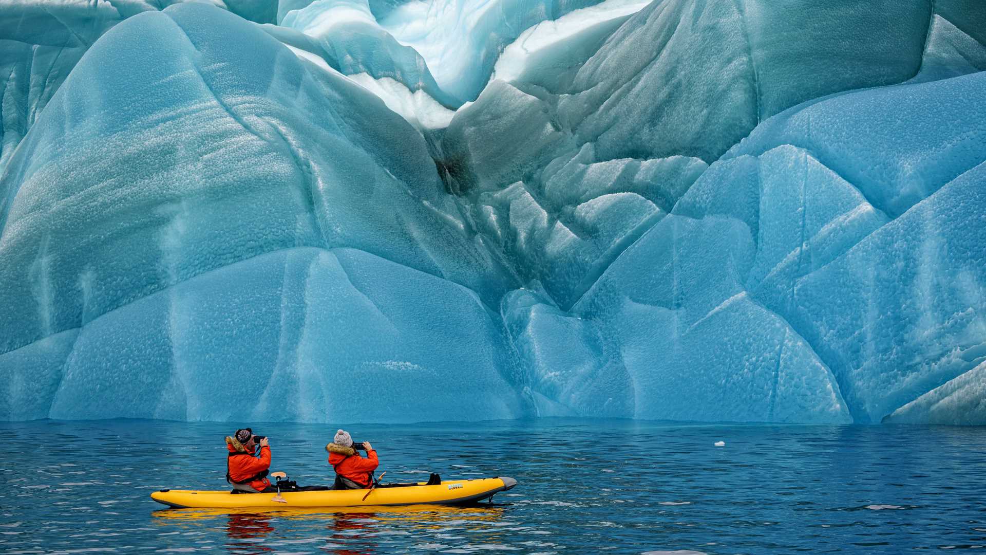 A light breeze rippled the surface of the bay where the ship waited. Several deep blue icebergs were just beyond the ship. The crew set up the portside gate for a morning round of kayaking. Conditions for a paddle were perfect.