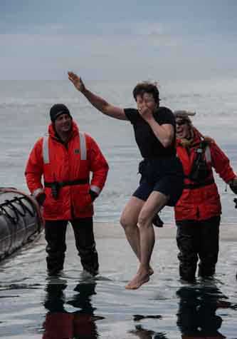 Back on National Geographic Explorer, it is time for the polar plunge. Some thirty brave guests participate by leaping from a shipside platform into the cold sea while expedition team members stand by to help them back on board. Certain participants find this experience so invigorating that they go in for a second refreshing dip while other more reticent guests cheer them on from the deck above.