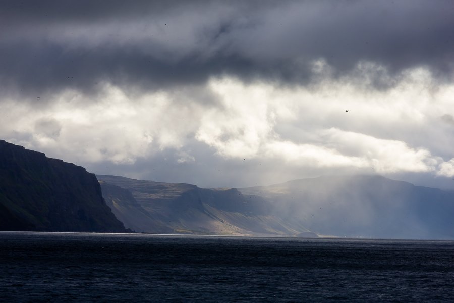 We awoke with views of the impressive cliffs of Latrabjarg ahead of the ship. Shrouded in low cloud, it was very atmospheric, and small flocks of puffins, guillemots, and kittiwakes moved around the ship. This cliff is especially important for razorbills, holding approximately 40% of the world’s breeding population, and we had great views of these beautiful alcids as they sat on the water and dived in front of the ship. The light passing through the clouds at the eastern end of the cliffs was a spectacular view as we cruised along these basaltic bluffs.