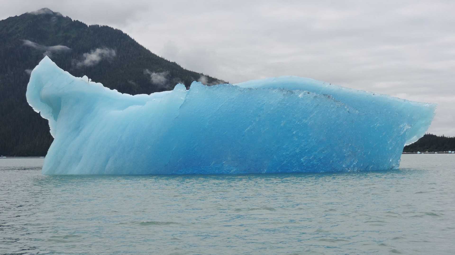 Our early morning boat excursions allowed firsthand magnificent views of LeConte’s ice calvings up close. We saw brash ice (crumbly stuff), growlers (chunks that rise out of the water less than one meter), bergy bits (pieces that extend between one and five meters above the surface), and ice bergs (large ice formations ascending more than five meters in height). Many of the impressive ice bergs were deep blue in color (Figure A). We learned that the blue color results from very dense, clear chunks of ice allowing visible light to enter deeply into or completely through them. The ice has to be clear, with very little or no air bubbles contained inside, so that longer wavelengths of visible light (red, orange, yellow, and green) are absorbed, and only blues are allowed to escape the ice. This is not an optical illusion, because it clearly shows in photographs and is the same phenomenon that makes deep, clear sea water appear blue. Some of the shapes reminded us of animals, including a turtle, a whale, a swan, and a merganser duck (Figure B). The entire bay was surrounded by typical, dense, verdant forested mountains.