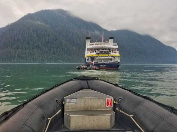 We started our day surrounded by fog and a garden of ice. We visited the ice fields at the mouth of Le Conte Glacier’s fjord. Le Conte Glacier is the southernmost tidewater glacier (glacier that meets the ocean) in North America. Cruising by Zodiac allowed us to approach massive icebergs that have calved from the glacier front and floated down the fjord until they became grounded on the underlying seafloor. The lack of wind created a beautiful glassy surface on the water, allowing for some stunning photo opportunities. We were also joined by a myriad of ocean critters, including harbor seals, bald eagles, and marbled murrelets.