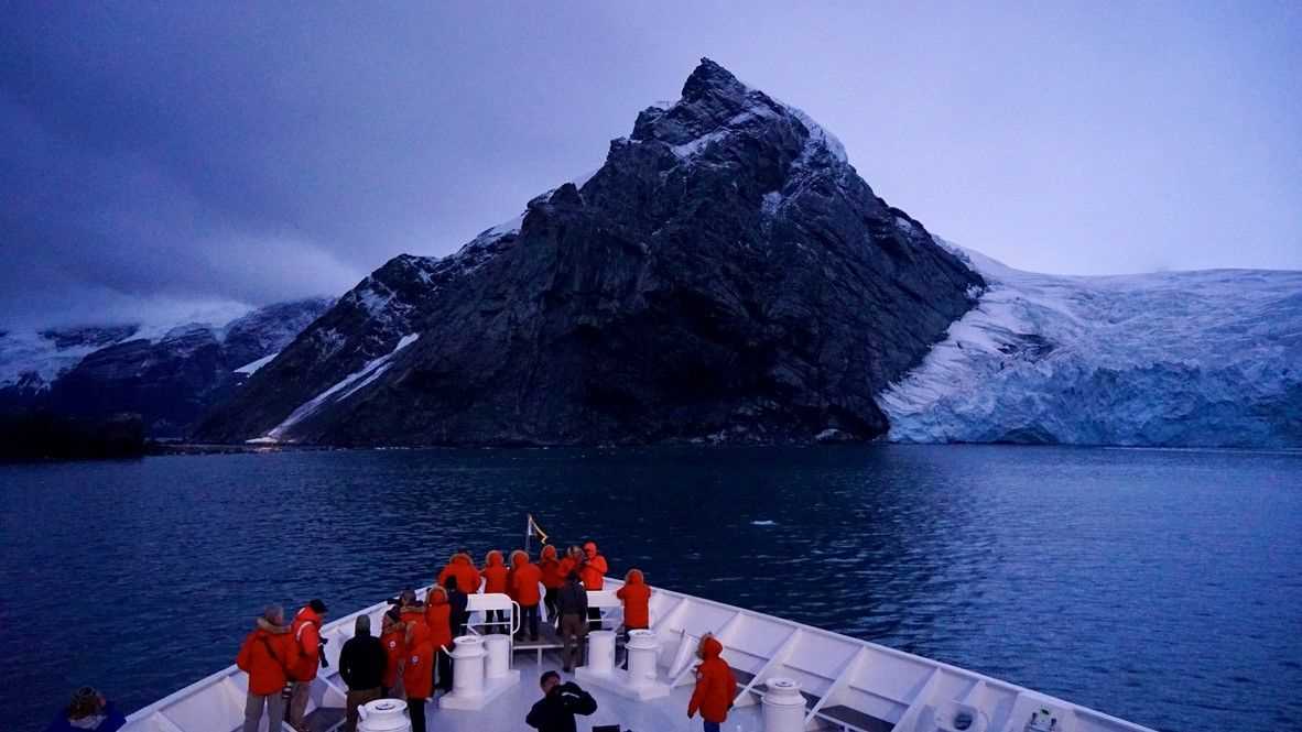 After dinner, we cruise the Charles Strait, the short-tempered body of water that separates Clarence and Elephant Island. With the skillful navigation of the bridge team, we arrive at Point Wild just on dusk. With beautiful still conditions, moody clouds and light snow dusting the decks it sets the scene of what Shackleton’s men experienced for their 105-day ordeal.