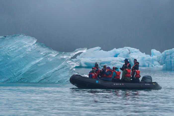 This morning we cruised into LeConte Bay surrounded by light drizzle and fog. We noticed ice floating in the water all around the ship. After we bundled up in warm clothes, we headed out into the bay to explore the various ice bergs that were grounded on the exposed terminal moraine. There were many large bergs that were beautifully clear and sculpted, others that were a mesmerizing deep blue color. We picked up a piece of ice and brought it into the Zodiac and were impressed by its slippery texture and cold temperature. Passing through a section of small bits of ice, we shut off the motor of the Zodiac and in the silence of the morning took a few moments to listen the sounds of the air bubbles in the melting ice. A highlight from the morning was seeing a bald eagle flying near a floating block of ice.