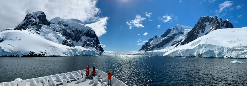 We started our day sailing to the northwest part of the Antarctic Peninsula. After an informative talk on Antarctic seals, led by Undersea Specialist Maya Santangelo, we were surprised with Frühschoppen, (a traditional German brunch of sorts). This included sausages, beer, Bloody Mary’s, bright skies, and a chance passing by of a leopard seal on an ice floe—all of which did only to add to the majesty of the Antarctic landscape.