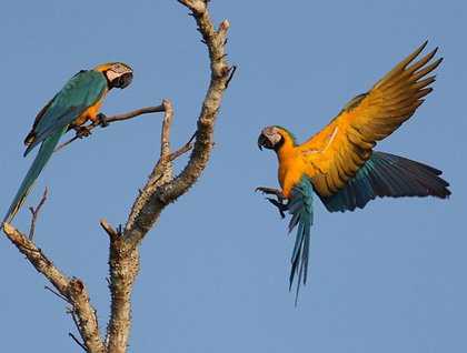 Exploration continued today by surveying the Ucayali River, and our destination made it possible to discover the wonders of two of the most iconic places of the Upper Amazon: Llanalpa and Dorado River.  We began our journey with a pre-breakfast skiff ride in order to explore the riverside area of Llanalpa. The blue and yellow macaws, which were perching on top of dead palm trees, gave the first surprise of the morning.
