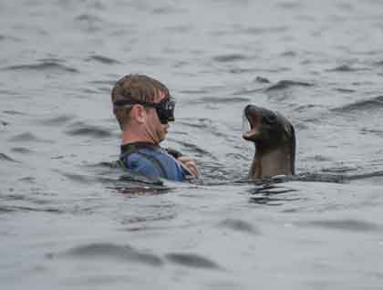 Then it was time for what one guest said was a life changing moment—swimming with the sea lions we had visited earlier in the morning. Swimming with sea lions is a physical interpretation of joy. They swim under us, around us, and even sometimes leap over us as they seem as enthusiastic about us as we are about them. In the end, one young sea lion decided it wanted more connection with our group and began literary to climb onto our backs, chew on our snorkels, and gently bite us in play.