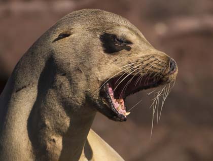 Los Islotes is part of the Mexican protected areas system and the northernmost portion of the Espiritu Santo Island Biosphere Reserve. No fishing is allowed around the small rock and the marine life abounds. It is also home for a small colony of California sea lions, the only pinniped that breeds in the Sea of Cortez. We got the chance to watch them at leisure from our expedition landing craft as we circled the islet shortly after breakfast; numerous immature guys, almost a year old, were active swimming around us showing a very obvious curiosity towards the strange creatures making those funny clicking noises from the top of those strange black floating things. Calmer and sleepier mature females endured their pregnancy while resting on the rock, whereas a few sub-adult males made noisy calls trying to claim a territory. We also saw several different kinds of birds, including both brown and blue-footed boobies, magnificent frigatebirds, brown pelicans, Brandt’s cormorants, and great blue herons. But the most surprising sighting of the day was a single sub-adult male Guadalupe fur seal, member of a species that lives off the Pacific coast of northern Baja. The species was heavily hunted during the 1700s and 1800s but now is recovering and some individuals show up inside the Sea of Cortez every year.