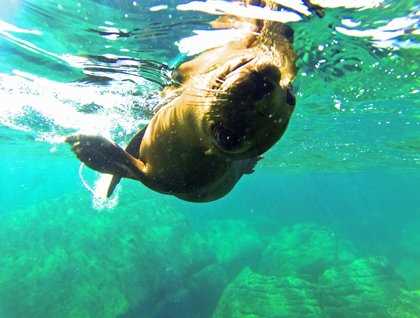 After our morning cruises, many bold travelers donned wetsuits, grabbed their underwater cameras, and spent the rest of the morning snorkeling with the sea lions. Most were playful, nipping each other (and sometimes us!), scratching themselves by contorting their agile bodies into a perfect circle, or darting toward us before flipping under and swimming away, only to come back and do it all over again. A large male sea lion wove his way around his fellow swimmers, always staying just far enough away from us. A cuddle pile of sea lions draped themselves across the rocks—and each other—at the bottom of the sea floor. Every so often, one spiraled up to the surface, flipped toward us and dove back down again.