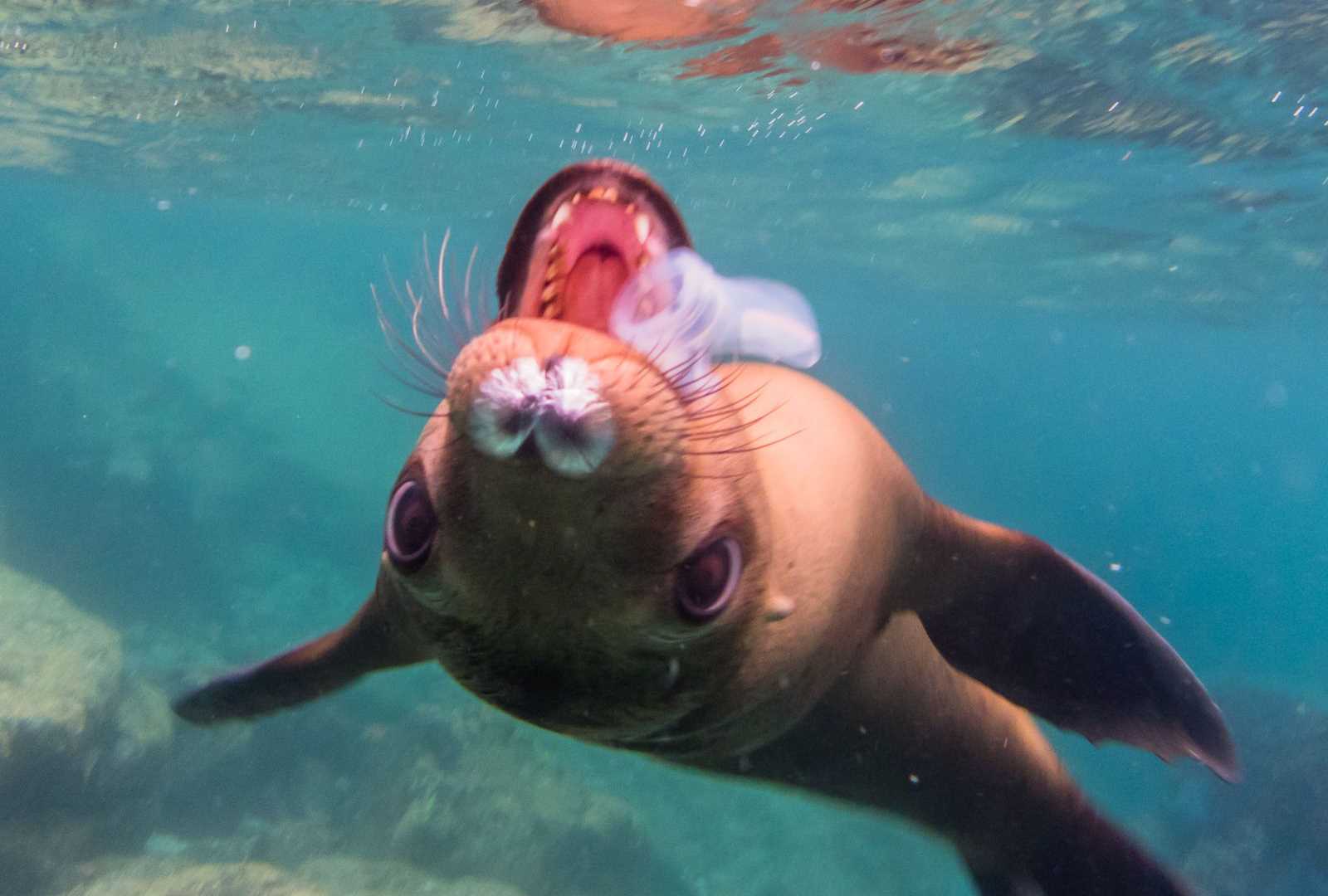 The pups were certainly the most spirited of the group. At times they would race at us, flying through the water, contorting effortlessly, making a beeline for our faces, only to take a quick nip at our masks and dart away just as quickly. Circles, backflips, twists, and glides are just a few of the maneuvers that these sea lions exhibit.