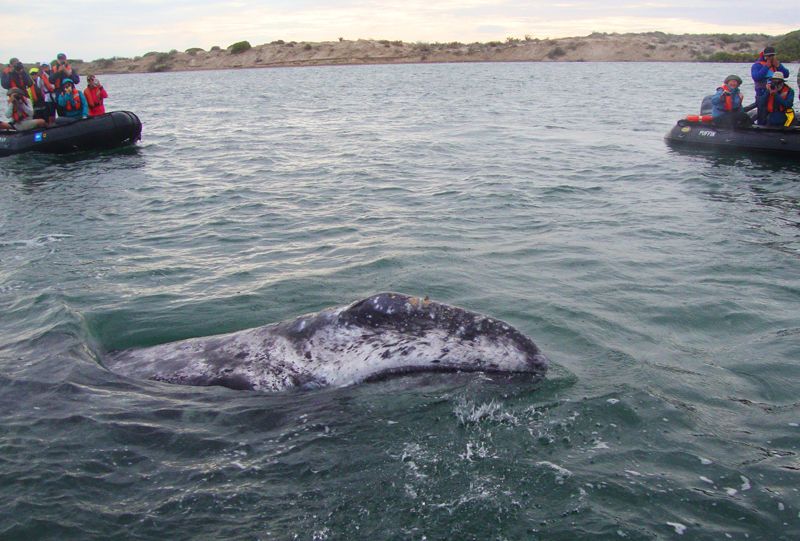We repeated whale watching today in Los Titeres (The Puppets), a location in the northern part of the Magdalena Coastal Lagoon, where some gray whale mothers were still nursing their calves. The animals, saving energy to commence their migration to the feeding grounds in the Bering Sea and adjacent Arctic waters, were calm and slow. They were not interested in interacting with humans at all, but probably more concerned in finding the right time to get out of the lagoon. With that, we still were successful in getting close to them. Some of our guests, in the last moment, were able to touch a curious baby that lifted its rostrum towards an expedition landing craft. Later, we left the area and moved south for the last outing, transiting on the Canal de la Magdalena, and anchoring in front of a narrow section of the island. We walked on the dunes to get to Sand Dollar Beach in Santa Maria Bay, where we discovered carpets of green and red plants, shells of all sorts, birds and interesting land snails, that live semi-buried in the sand while attached to plant material; their spiral, ornamented shells are blown by wind and covered many places. This fantastic journey with the gray whales came to a wonderful end.