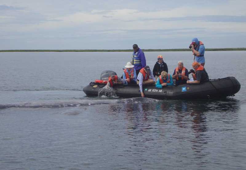 This our second day of whale watching in the calm waters of the Magdalena Coastal Lagoon was extraordinary: guests and naturalists went out on the expedition landing crafts and found Olivia, a very experienced mother gray whale that has been well known by her friendly behavior in past seasons. She and her baby were just outstanding because allowed us to stay around while they were resting and possibly sleeping, just logging at the surface with no interactions at all. Maybe they are enjoying our company, so confident, so tolerant. Eventually, the slow current drifted them next to our boats and all guests experienced the magic moments of touching a whale! Later on, we left Olivia and her calf for navigation southwards in the canal (flanked by wonderful mangroves, birds and moon-looking sand dunes) to reach our afternoon destination at Sand Dollar Beach. In the hikes across the dunes of this section of Magdalena Island, we encountered two jackrabbits that rapidly ran away from us, as well as the interesting vegetation that covered them in small carpets. Hundreds of seabirds, shells of snail and bivalve mollusks, polychaete worms (marine cousins of earthworms and leeches) and other beings, dead and alive, were also present in this fascinating environment.