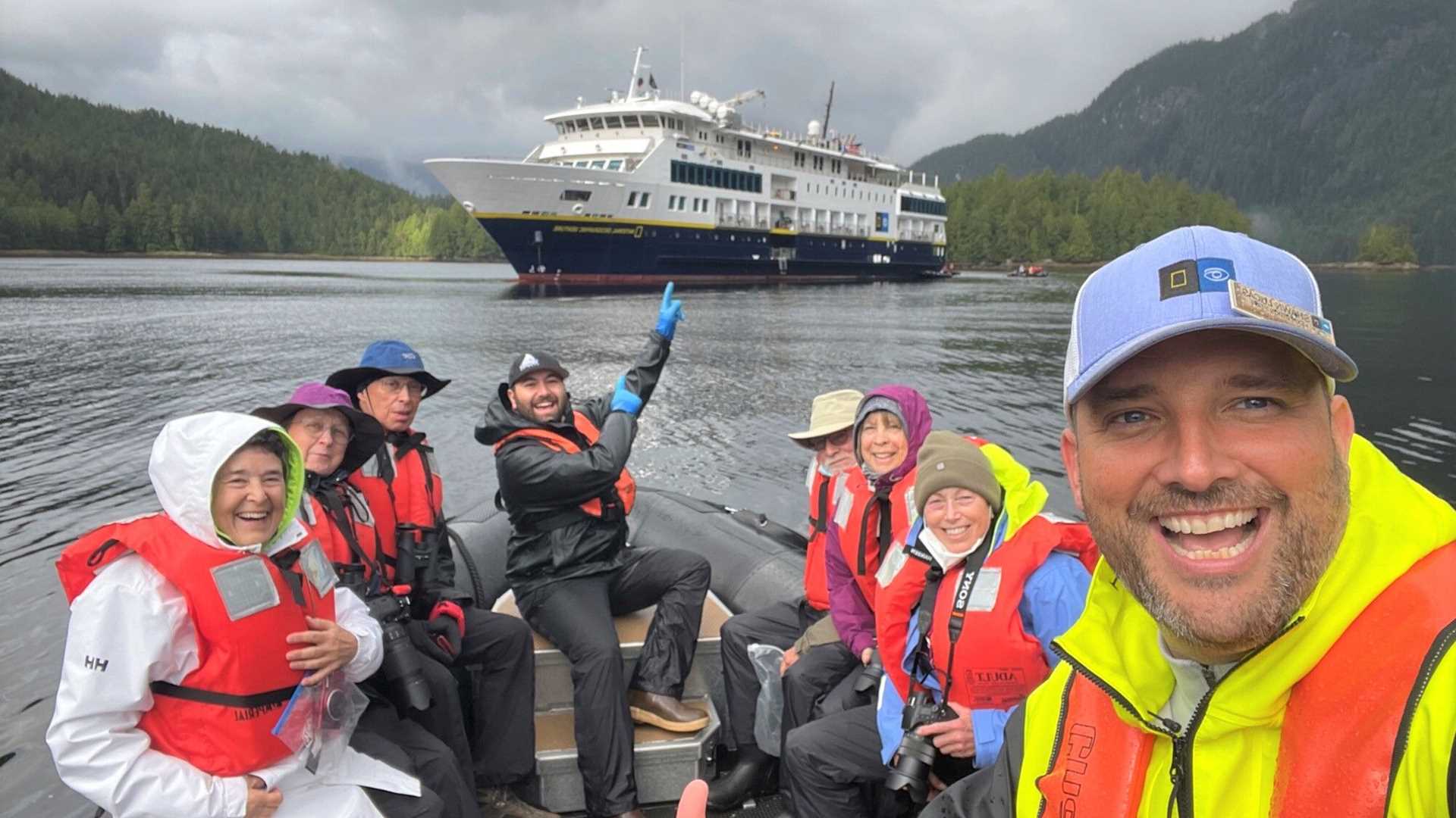 Morning found National Geographic Venture nestled in the scenic fjord of Gilttoyees Inlet. This scenic waterway is numbered with countless waterfalls that cascade down the steep walls on each side. Intermittent clouds, drops of rain, glimpses of blue sky, and the occasional sunray greeted us as we made our way, soaking, through the raw beauty of the inlet. Throughout the morning, guests were treated to a couple of programs from the naturalist team, including: “Smartphone Photography” from photo instructor Andrew Peacock and “Rainforest Ecology of the Tongass National Forest” by naturalist Lee Moll. Just before lunch, a group of humpback whales close to shore greeted us. The outside deck and bow soon filled with eager eyes as we watched countless showings of beautiful flukes. After lunch, we tucked into the ever so stunning Lowe Inlet. Two rounds of Zodiac cruises brought guests into the calm and beautiful waters in search of wildlife. Harbor seals, eagles, salmon, and the raging Varney Waterfall greeted us on our cruise through this stunning landscape.
