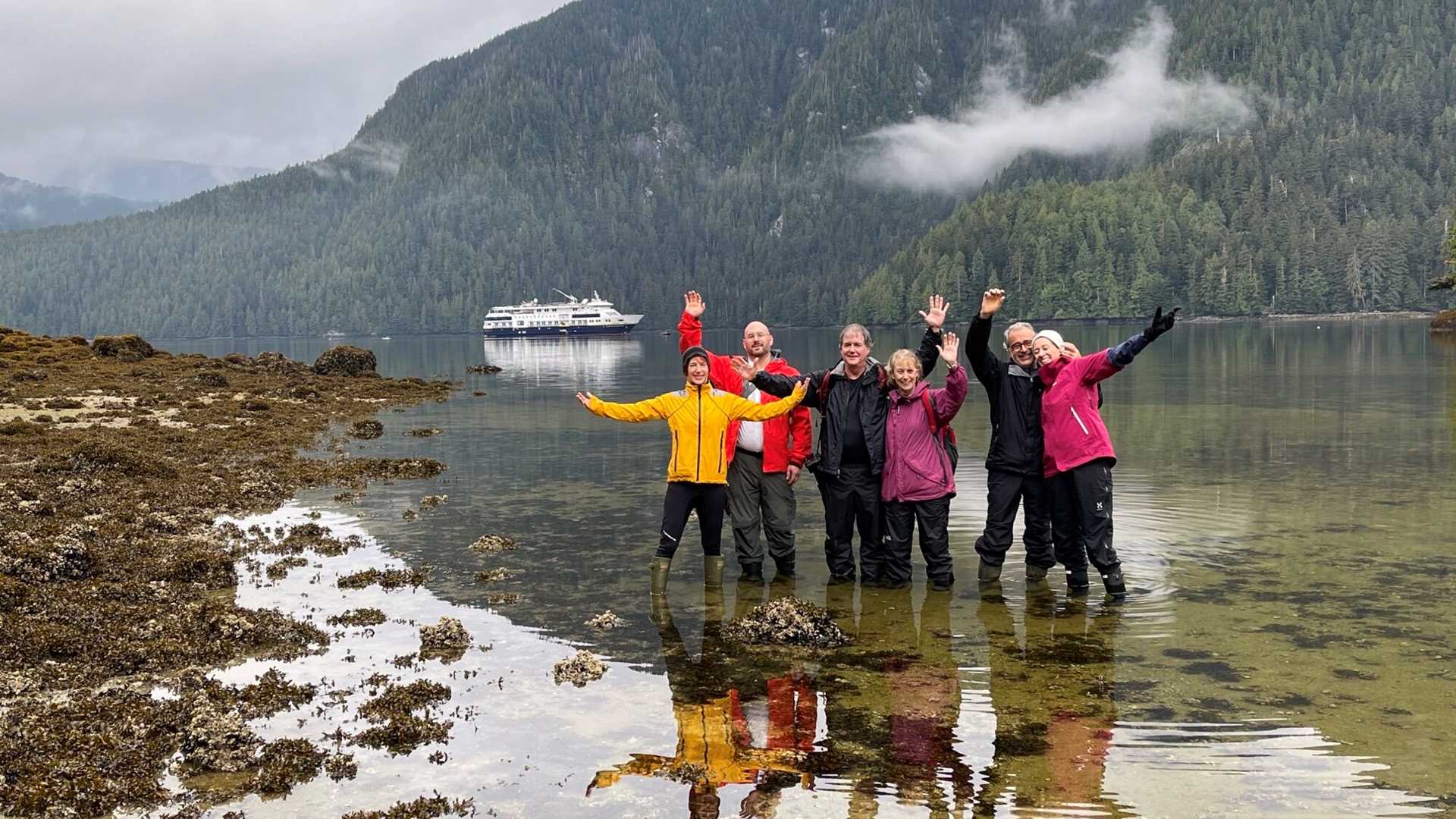 Our first hint of the temperate rainforest greeted us this morning with scattered rain, mist, and mountains, providing the perfect backdrop for our hikes ashore. We also launched our fleet of kayaks into the serene and quiet waters of Lowe Inlet. The theme this morning was all about reflections. The low tide and calm winds allowed for beautiful, reflective scenes, whether we were hiking or kayaking. The water was glass-like and provided the most tranquil scene that was only disturbed by the movement of a paddle stroke. On shore, guests had the chance to casually walk throughout the intertidal zone, where each step they took had the sponginess of the rockweed, the crunch of barnacles, and the chatter of ravens to keep them company. Guests could also do a bit more exploring on one of the two bushwhack hikes, and they had the chance to meander along the shore as well as into the forest for a completely different adventure. Berries, fungi, and even carnivorous plants awaited those who ventured deep into the thickets of trees. After our morning explorations at Lowe Inlet, the ship weighed anchor and headed back out into the Glenville Channel and towards Prince Royal Island in search of wildlife.