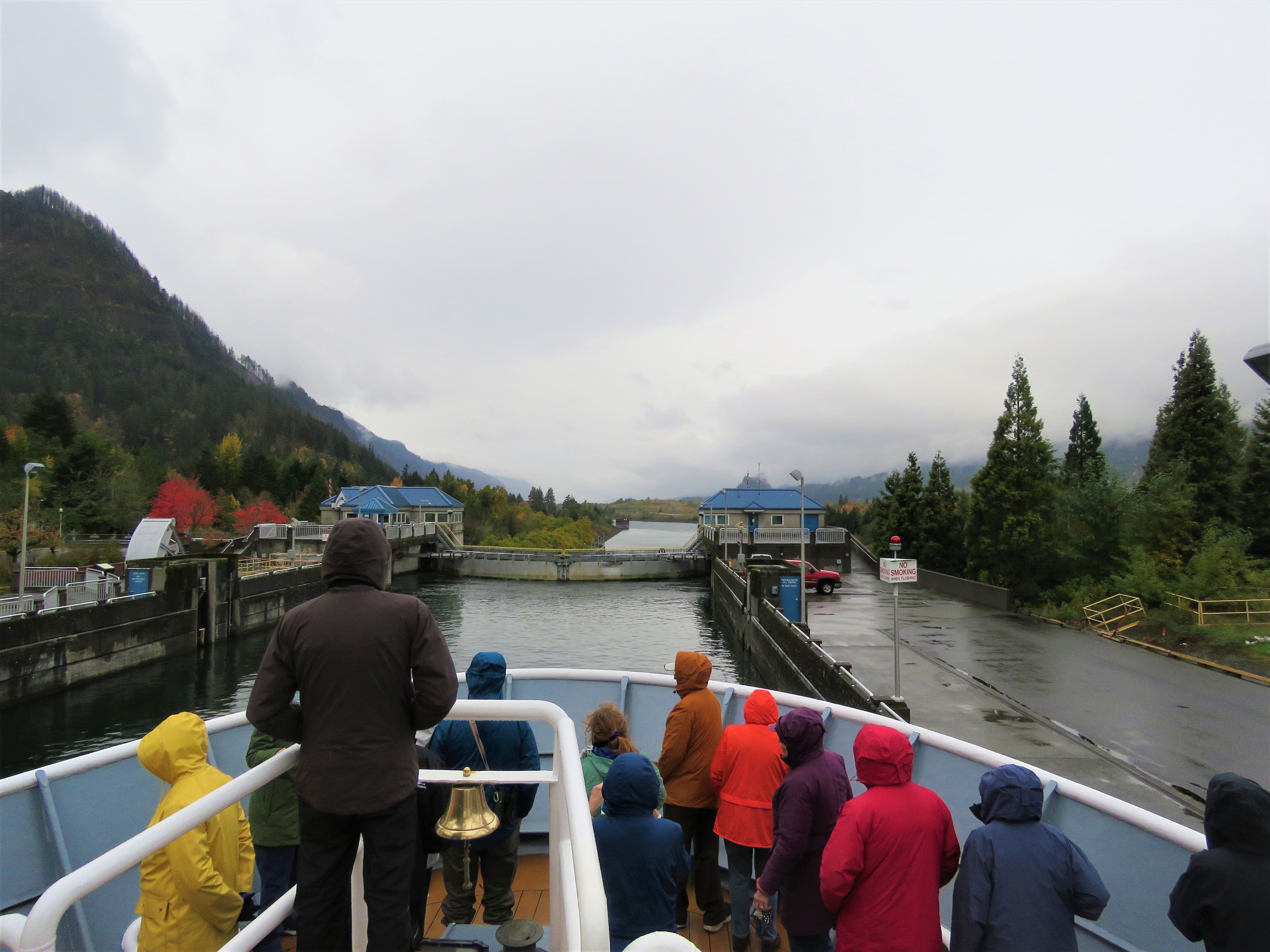 This morning the wind and rain at the western end of the Columbia River Gorge did not deter our ensemble from gathering on the bow in bright and waterproof colors to witness our eighth and final lock and dam – the mighty Bonneville Dam, completed in 1938. We then passed by Beacon Rock on the Washington shore, followed by the iconic Multnomah Falls on the Oregon side. After lunch the weather turned sunny and guests gathered on the aft 100 level to enjoy hot apple cider with additional libations of their choice. Mount St. Helens made a brief surprise appearance, peaking above the clouds as we narrowed the distance to the mouth of the Columbia.