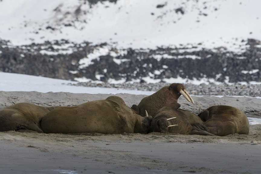 While guests were enjoying learning about the history of the whaling industry in Svalbard, the Zodiac cruisers got a real treat, going to a walrus “haul-out”, an area where these massive animals gather on shore to rest in between their feeding forays. Sometimes walrus can weigh as much as two tons, and can live up to forty years. This was a great opportunity to see one of the iconic animals of the Arctic!