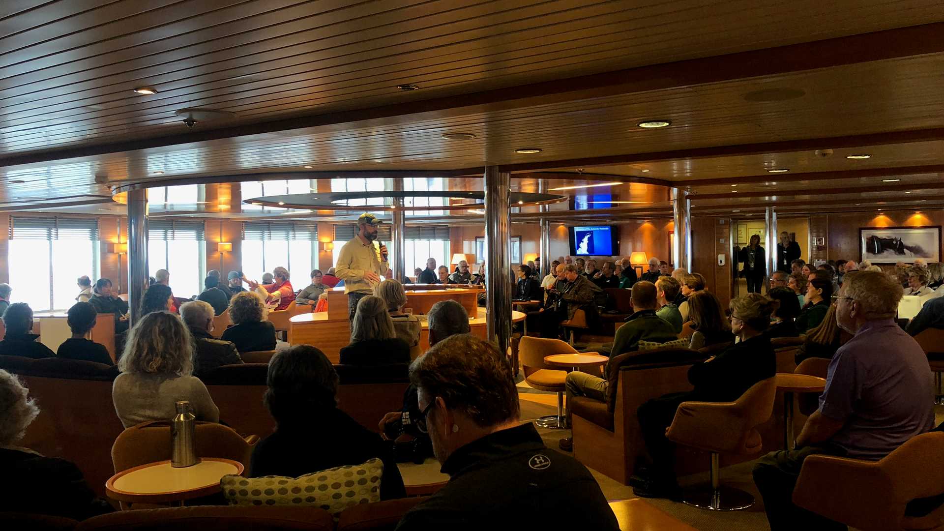 To prepare us for our forays into the land of the penguins, naturalist Doug gave us a wonderful talk called “Penguins of the Antarctic Peninsula,” which focused on the amazing life and times of our soon-to-be penguin friends. He talked about how penguins found mates, had their penguin chicks, and raised them in an often-inhospitable world. He also talked about some of their favorite hobbies: standing on ice floes, collecting rocks, tobogganing on ice and snow, eating krill, and avoiding death by leopard seals.