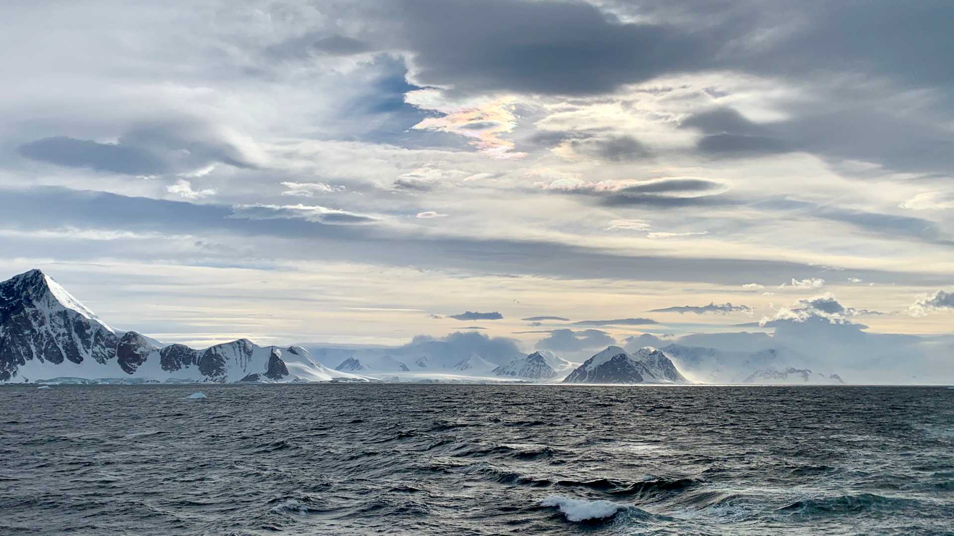 We have spent the day south of the Antarctic Circle in Marguerite Bay, far enough south that at this time of year the sun never goes below the horizon, and there is no night. It was a great day to contemplate the breadth and range of conditions that shape our experience here. Our original intention was to visit Stonington Island, site of historic US and UK bases which were used periodically from the 1930s through the 1970s, but as we approached, the calm winds out in Marguerite Bay rapidly changed to ferocious katabatic winds, driven by air flow off the mainland ice sheet and tumbling down through the mountain valleys and over the surrounding glaciers. So off we went to explore alternative sites with more favorable conditions. We found ourselves amongst minute lichens, multi-hued rocks, brooding penguins, ridges of glacial debris, and a vast white plain of sea ice, surrounded by mountains and glaciers.