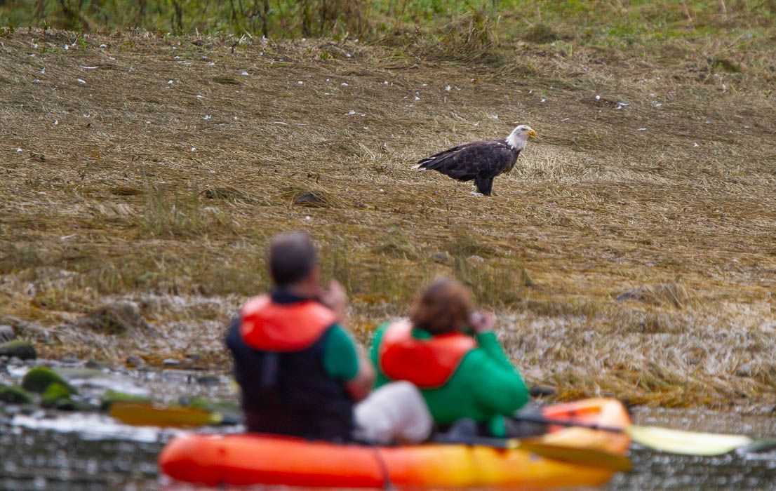 As we carefully approached a couple of eagles on the beach, some of the kayakers got close encounters with these majestic birds. We were lucky to see one of the eagles pick up a fish and perch not too far from us. We watched it for a long time, as it fed while standing on a moss-covered branch, and took amazing images of one of Alaska’s most iconic birds.
