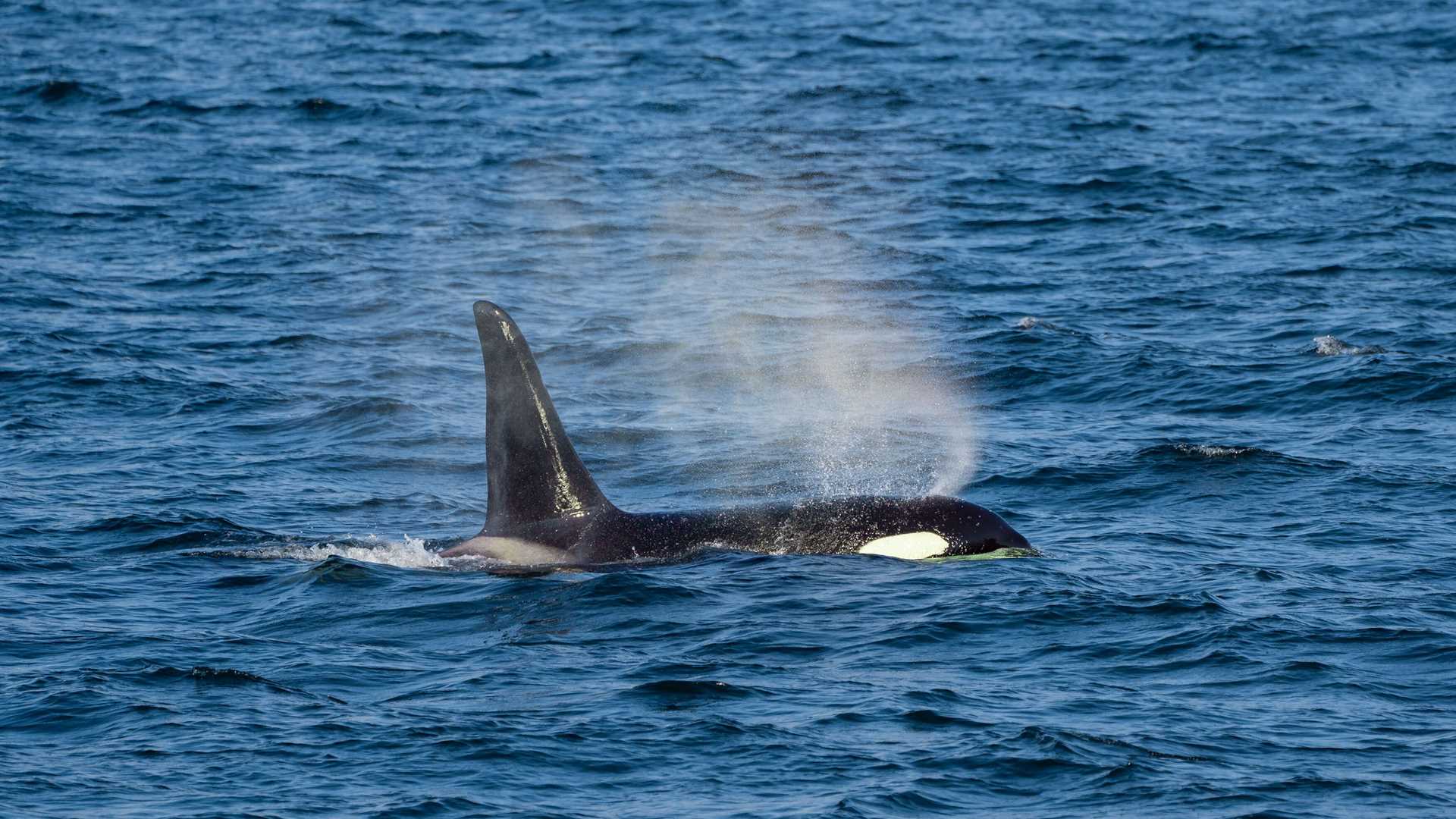Photo caption and photographer: A male orca passed by National Geographic Sea Lion and produced a stunning spout. The water molecules struck the sun just right and produced what naturalists affectionately call a rainblow. Photo by Shayne Sanders