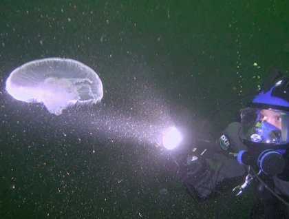 Directly beneath the owl eyes at Owl Pass, our chef Michelle and I punched through the brackish surface waters to explore a cold, dark, yet clear underwater world. The steep slopes above continue underwater as we explored a vertical, and sometimes overhanging, world of rock and invertebrates. The abyss called from below, a rich blue-black hole of mystery awaiting prying lights and eyes. We encountered a field of feather stars and watched thousands of arms fluttering gently like wheat in a breeze. There were more feather stars on this dive than I’ve seen in my entire diving career. Arms held up into Misty Fjord’s sweeping currents, the feather stars capture drifting particles, much of it organic material resulting from the salmon runs nearby. We rode the tide for minutes, barely a kick of our fins was needed to cruise with lion’s mane jellies and moon jellies. Our lights passed over sponges bigger than kegs with crabs and shrimp slinking back for protection. We could have sailed all day in this alien world, but the surface—and British Columbia—was calling. We ascended to a mussel bed packed with feeding Dungeness crabs. The rock face was simply boiling with crabs, all of them prying and crushing salmon-fueled mussels while the tide was still high. Everything in this bay, from the swaying feather stars to the shy rockfishes relies on salmon in some way.
