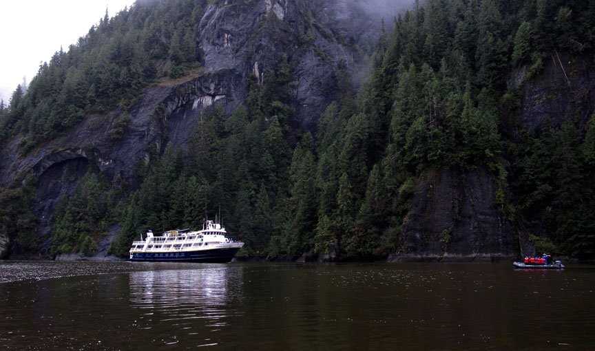 To enter Rudyard Bay, National Geographic Sea Lion passed through a narrows known as Owl Pass. Those interested in photographing the vessel as it traveled through the pass were well clad for the ‘very heavy mist’ (aka RAIN) and boarded the expedition landing craft with cameras in hand. This was followed by tours through the misty, ethereal landscape of Rudyard Bay. Some waterfalls cascaded down the sides of slate-gray, glacially scoured rocks, while others freefell hundreds of feet from the steeper walls of the fjords.