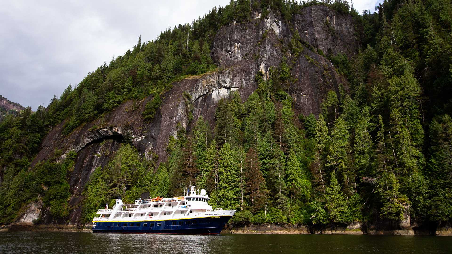 Overnight, National Geographic Sea Lion brought us through Wrangell Narrows and Clarence Strait from the town of Petersburg, Alaska to Misty Fjords National Monument. We spent the morning enjoying the views from the decks of National Geographic Sea Lion as we slowly cruised through the fjord. In late morning, we boarded small passenger vessels to explore the area. We watched our ship come through famous Owl Pass, and we got a closer look at the forest, the waterfalls, the salmon, and the eagles. We got an even more intimate experience afterwards when we explored the area by kayaks. We watched as the zombie salmon in the streams fulfilled the last days of their cycle, which is critical to the old growth forest ecosystem. We even got to see a double rainbow over our ship! Later in the afternoon, naturalist and cultural interpreter Sharon Grainger gave a wonderful talk about Native American culture and art. In the evening, we enjoyed the views from the deck as our captain navigated us back through Behm Canal towards Dixon Entrance. Tomorrow, we arrive in Canada!