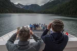 17,000 years ago, this area was all ice, under a mile thick in some places. Carved by glaciers, the basalt walls reach up in sheer cliffs over 3,400 feet tall and then descend into the water at depths of 1,000 feet. Here mountain goats live up in the rocky reaches, and brown and black bears forage at the water’s edge. We spotted a mountain goat up on its granite perch 2,000 feet up a vertical cliff. Below the cliffs, the landscape is dominated by western hemlock, Sitka spruce, and western red cedar.