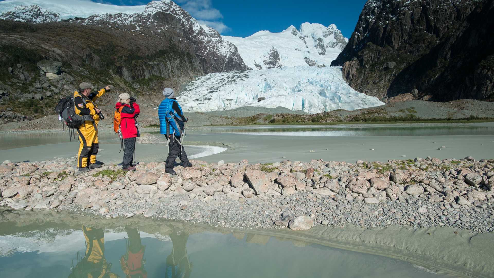 The beautiful weather we all enjoyed yesterday continued today. As day broke and the first rays of sun lit up the snow-dusted peaks we could fully appreciate the narrow Montañas fjord that the ship is sailing along. The rocks along the coastline were mostly well rounded and sparsely covered with vegetation, telling us that once they felt the full strength of huge glaciers which carved out these landscapes. Further in, the slopes rose ever steeper and the tops of the mountains became jagged and covered in ice. More glaciers appeared, some tumbling down to the shoreline. Occasionally huge boulders and smaller rocks could be seen strewn about the shore and as we drew abeam of them glaciers could be seen back from the main coast; these have retreated and small tidal lagoons could be seen. As the sun rose and the large moon set, we were left speechless at the incredible beauty of the glowing snow and ice, as well as the green and brown reflections from the coastal rocks and trees on the flat calm waters. Off in the distance the mountains were covered by extensive fields of ice.