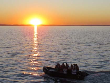 They say the tide waits for no man and that certainly was true for us this morning as we embarked for a Zodiac cruise of Montgomery Reef at 6:00 a.m. The sun had only just peeked over the horizon but this was the time when the tides were best for observing an amazing natural phenomenon. On a falling tide, Montgomery Reef rears out of the ocean like a waking giant casting off its watery blankets. Hundreds of silver waterfalls run off the huge sandstone block, racing their way to the open ocean as the tide recedes. This massive movement of water attracts a lot of wildlife and we enjoyed watching egrets and herons fishing in the shallows, while the sharp-eyed among us spotted green sea turtles in the channel. En route back to the ship we made a quick stop at an emerging sandbar, where our hotel staff had kindly set up a juice bar to greet us. Following this, we got back to the National Geographic Orion just in time for breakfast!