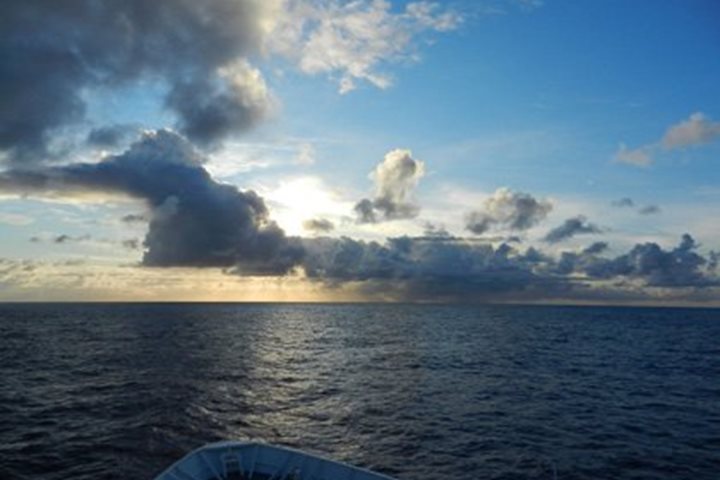 As we departed Moorea, the sun was moving lower in the sky, and spinner dolphins once again paralleled the ship as we departed the island, leaping in the late day sun. The sunset behind the mountains sent golden shafts of light illuminating and penetrating the clouds, reaching down to the sea below.