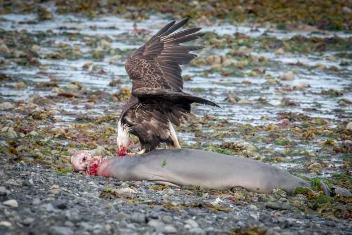 Hundreds of gulls lifted off as the first hikers arrived on shore, and a number of bald eagles surrounded what turned out to be a dead young elephant seal on the beach. After snapping some photos, those who chose the long exploratory bushwhack took off up the river to see what they could find. Sitka black-tailed deer were spotted in abundance, and tracks of the eagles, deer, and bear could be seen covering the muddy shore. Everyone got back into the forest where more evidence of bears could be seen, from game trails, to recent diggings, and fields of skunk cabbage torn up. Those on the shorter hikes got to come back to the beach and cruise the shores by kayak and stand-up paddleboard, watching wading birds, a sea otter slinking around, and humpback whales in the distance. As we rode back to the ship, the smell of chili got stronger and the rumblings in our stomachs got louder.