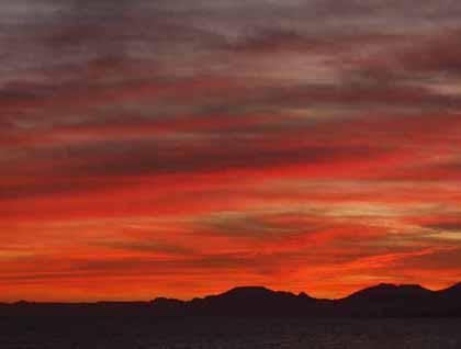 Contributing to the continued joy of everyone aboard the National Geographic Sea Bird, a beautiful red-pink-orange-magenta-and-yellow colored sky welcomed us while navigating south of San Francisco Island (our anchorage last night). Without hesitation our photographers and their cameras worked hard at capturing the uniqueness of this natural palette arranged by nature and produced by the light of the rising sun. The Gulf of California is known, among other things, for the beauty of its scenery and this morning was no exception. The gorgeous light of the sunrise also swept the high and rugged peaks and stratified walls of the La Giganta Range, the magnificent volcanic mountains that characterizes the southern half of the peninsula. They were topped this morning with a dense layer of low clouds and fog. A little breeze brought us a bit of rain and, consequently, a rainbow that looked like a long high-lying wound in the heavens. In the distance, on the quiet, dark ocean we discovered some little blows that indicated the presence of small marine mammals—dolphins, scattered seabirds glided or flew in different directions.