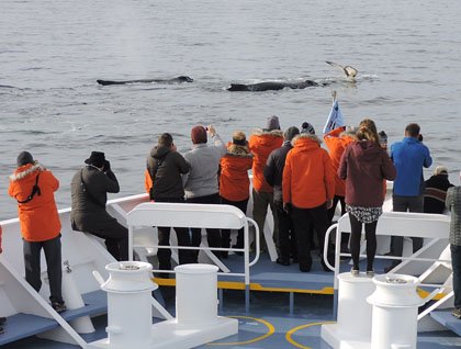 The Galley staff served ice cream and champagne on the Foredeck during Tea Time, so we could do some communal feeding of our own. At the same time, masses of krill could clearly be seen on the bridge’s sonar directly below us. We stopped the ship numerous times and were rewarded with various groups of from three to five individuals approaching us. It was amazing to watch and hear these great animals swimming, feeding, and breathing all around our vessel while we simply drifted. We witnessed a very interesting behavior known as “bubble-net” feeding close to the ship, by which at least one whale in each group swims in a tight circle and creates an encircling sheet of rising bubbles that apparently frightens and concentrates the krill in the center. This makes it easier for the whales to then swim up and feed upon the concentrated krill masses. It is a very interesting and successful strategy. We eventually completed our transit of Dallmann Bay and then began our recrossing of the Drake Passage back toward Tierra del Fuego. After dinner, we were regaled and entertained by our very talented crew members with an unforgettable National Geographic Orion Crew Show.