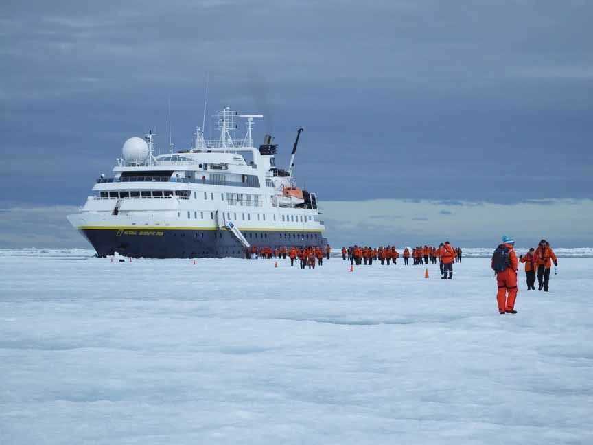 While trying to reach Stonington Island, the bridge team noticed some fast ice in Neny Fjord nearby, so we headed that way. The Captain skillfully drove us into the fast ice, which held at the head of the bay. The ship forced its way into the ice far enough for us to put down the gangway and get everyone off the ship for a spectacular trek along the frozen sea.