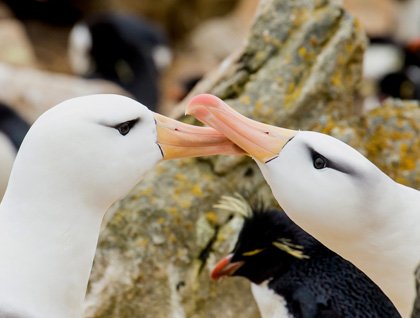 The Zodiacs land us on a white sand beach, and we stride out for the western cliffs. Serenaded by scarlet-suited meadowlarks, we traverse the lush green sward of old sheep pastures, now dotted with upland geese and their fluffy goslings. Soon we can hear a distant hubbub on the wind, and the racket is revealed as we reach the cliffs: in a natural rock amphitheater, thousands of rockhopper penguins, imperial cormorants, and black-browed albatross are nesting where the wind whips up the cliff face. It is a spellbinding wild spectacle: we settle to watch the placid albatross perched on their adobe apartments while below them the feisty rockhoppers squabble and cackle in the street.