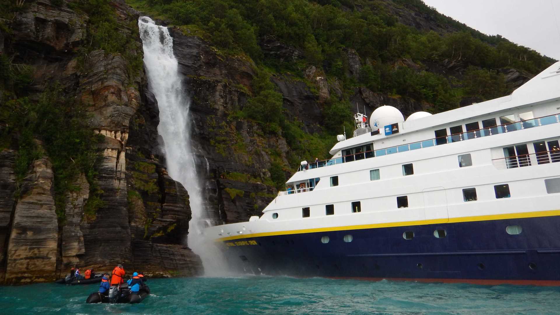 As we get out of the water we find the galley team already on shore collecting mussels for dinner and the birthday boy Teddy rodfishing from a Zodiac. Wildlife around us is quite abundant, with oyster catchers in the air and harbour seals in the water, but the highlight of the day was yet to happen. Right after lunch we offered a one way Zodiac cruise from the end of the fjord to a waterfall. Putting our full force of Zodiacs in the water, guests were zoomed around, close by the steep and reaching rock walls. We were soon overtaken by the National Geographic Orion passing by to show us the way. At our arrival, we had the biggest of surprises, look at the photo to believe!