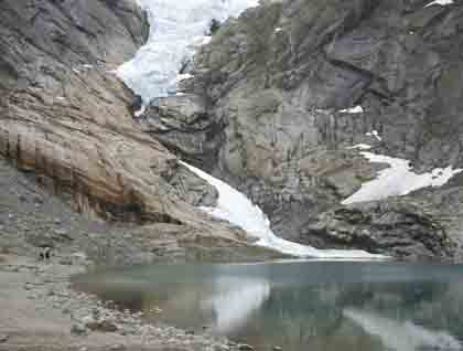 Briksdal Glacier has retreated dramatically since the latter part of the 18th century. A series of signposts at points along the trail indicate its former extent and successive stages of retreat. The meltwater lake below it now reflects a much diminished ‘river of ice,’ one modified element in an ever changing landscape.