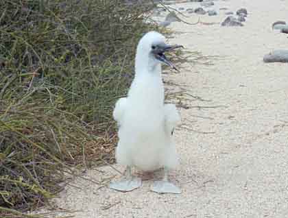 Walking along the sandy trail we observed small marine iguanas. Their size and black color contrasted with the yellow land iguana which was two or three times larger. Just beside them, a group of female sea lions slept pleasurably while their noisy babies tried to wake them up to nurse. At the opposite side of the trail there were many blue-footed boobies nesting, feeding their chicks or incubating their eggs on the ground. Magnificent and great frigatebirds with their red pouches inflated, were the delightful to our guests.