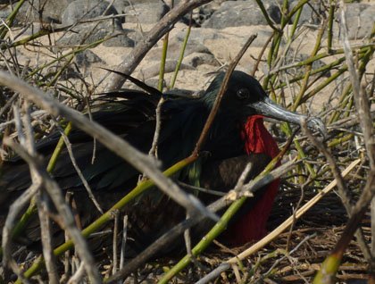 Male frigate birds of the minor type had also worked hard inflating their pouches. It was so hot and dry this morning that some of them had decided to take a nap instead and the females were not particularly interested.