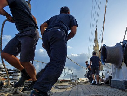 As we break through to the outer coast, a light breeze cools us from the strong equatorial sun that is beating down upon us. As we pass a breeding colony of frigatebirds, we observe a female magnificent frigatebird make a few passes overhead before landing in front of us. After a persistent squawk from the chick, the mother regurgitates an instant meal for her chick, and then takes to the air again to continue to search for food. Various skeletal remains along the coast remind us that this is the uninterrupted path of life, and survival can be a struggle for these creatures. Bobbing upon the turquoise waters, we return to the ship to continue our navigation west.