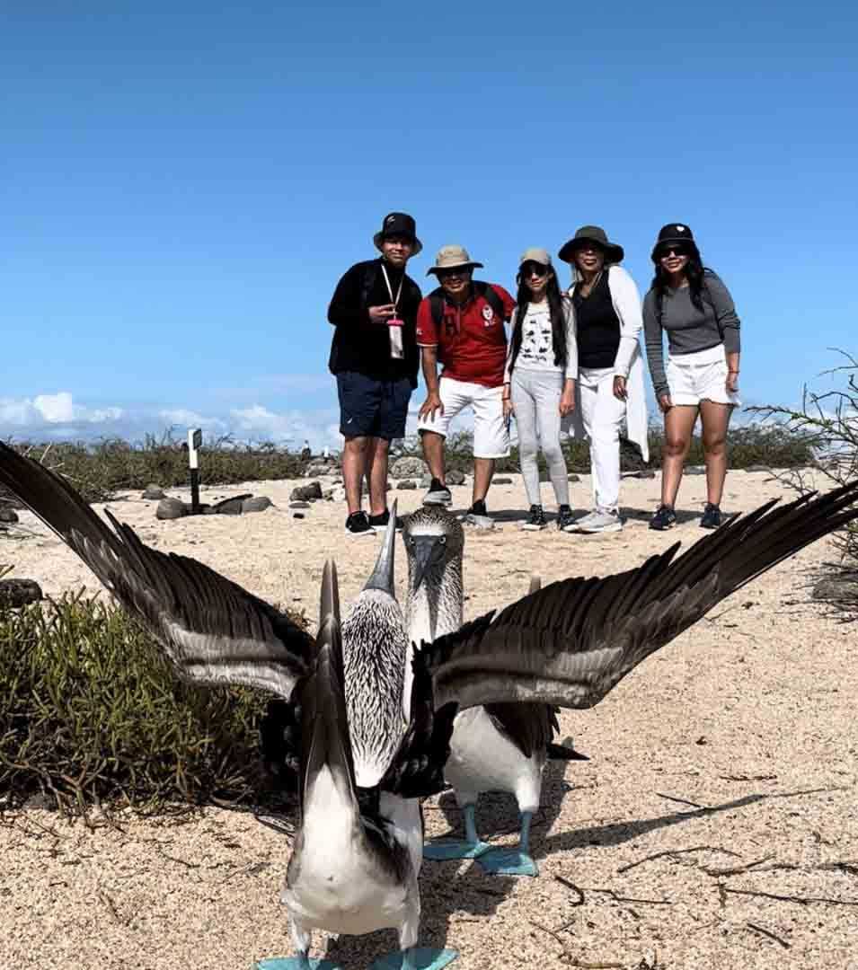 In the early morning, we went for a hike in a seabird paradise, Seymour Island. An uplifting brought corals, boulders, and rocks to the surface, creating a small and flat island compared to others in the archipelago. In this unique area, we found some species of seabirds nesting. The magnificent frigatebird and the great frigatebird–two of our favorites and the pirates of the sky–have both chosen this island to live and nest. They probably chose this area since the surrounding waters are great fishing spots. We spotted many males with their red pouches fully inflated to attract females. At the same time, the blue-footed boobies were all in love. We saw many couples. Males did their mating dances, giving presents to the females who were starting to nest. It was truly a unique experience to hear the sounds and to see the males dance and perform, all to win the hearts of the females.