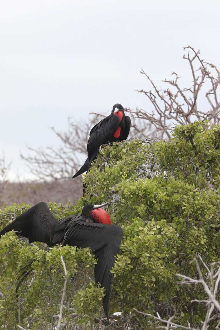 Frigates are nesting, which means that the males inflate their red sacs to the size of soccer balls and then display to females for mating. Some of them are already sitting on the eggs or even raising the youngsters.