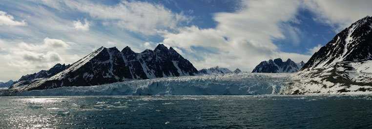 After enjoying warm weather yesterday, today was a real Arctic experience, with the temperature hovering around freezing for much of the day. This did not deter us though, as we boarded the Zodiacs to enjoy the ice around the Monaco Glacier. This massive glacier has filled the fjord with calved ice, and it was fun cruising amongst the blue ice contrasting with the pancake-flat sea ice. A few bearded seals were lounging on the ice, and a couple of pure white ivory gulls were seen as well.  Photography was a challenge because there was a scenic shot in every direction. No matter which way we turned, the vista was breathtaking.  An ice-choked fjord leading to a towering glacier face, all the time having massive black mountains looming high overhead. Quite a lovely spot.