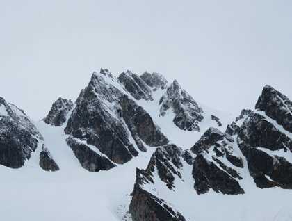 At 0630 hrs the National Geographic Explorer is sailing into Fugelfjorden, “Bird Fjord,” toward Svitjodbreen (breen means glacier), an exit glacier from Valsahvøya icecap to the south. Bold, dark mountains carved by ice into sharp peaks rise steeply on either side. Cirques, cut into those mountains by glaciers, brim with ice and snow within while heaps of glacial till spill out of their lower edges. Snow and ice come right down to the sea; this is fitting, for Spitsbergen means “sharp peaks” and Svalbard “cold shores.” Above this lead-gray arm of the sea, low clouds hide the highest mountains. Soon Svitjodbreen is obscured by fog and a keening wind whips around outside the bridge, carrying whirling snowflakes. There will be no Zodiac operations here in these conditions. We turn and sail for Bjornfjorden in the lower reaches of Smeerenburgfjorden. Here the broad calving face of Smeerenburgbreen rises 60 meters above the sea water in the fjord. Soon we hear a loud cracking sound and a giant chunk of ice falls with a roar off the face of the glacier, sending out a great wave and leaving a big blue patch on the freshly exposed ice of the calving face. While waiting in hopes of another calving event we are astonished to see a great skua, the fiercest predatory bird in Svalbard, drive an arctic tern right into the water in a vicious attack that kills the tern. The skua then tears into the tern, having breakfast right there on the water between the ship and the glacier.