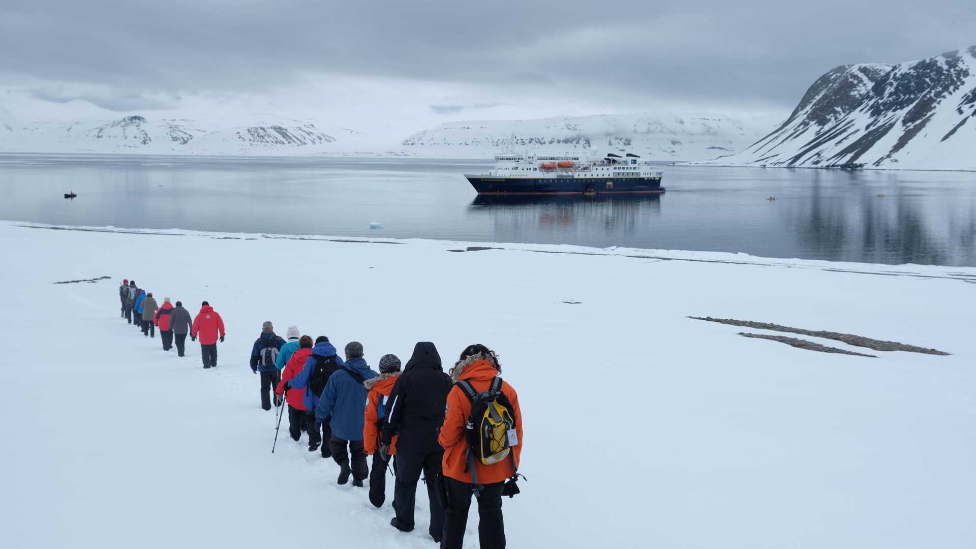 The planned morning activities included kayaking and numerous walks in Faksevagen. As we came ashore, snowflakes gently fell to the ground under the flat, calm conditions. The walks followed the shoreline and just above the high-tide mark, ice and snow covered the ground sloping gently up to the nearby hills. The pebbly beach, made up of many colored, well-rounded stones, became a topic of conversation. There was a lot of algae along the way, as well as other marine invertebrates. We also saw a number of captivating birds, including common eider ducks out in the fjord and a pair of rock ptarmigans spotted by long hikers. During a couple of moments of silence on the water, the eiders could be heard chatting.